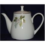 White china with autumn tone leaves, blue and red berries. Silver trim.