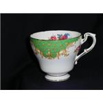 |  ROCKINGHAM Ivory fine bone china with a stylized green and gold border and an elaborate arrangement of flowers. Gold trim. |