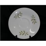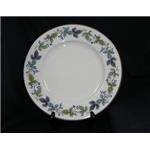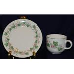White china with band of green, light and dark blue leaves amongst stylized grapes. Silver trim.