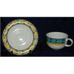 Off white china with blue and yellow bands. Blue and red decoration. Blue trim.