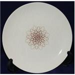 White china with geometric border and a white flower contained inside a stylized border. Gold trim.