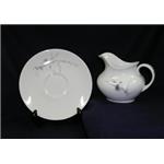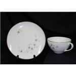 White bone china with pink-purple lily pad and grey circle. Silver trim.