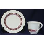 White bone china with maroon floral stylized border. Gold trim. No. H5026