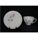 Cream bone china with delicate pink roses, yellow and white flowers. Sivler trim. Made in England.