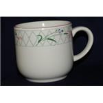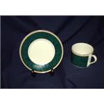 White china with green stylized band, flowers and leaves. Pink trim. Stoneware