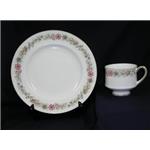 |  BELINDA White bone china with a pink and blue floral border. Gold trim. |