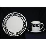 BLACK KEYSTONE White bone china with Grecian marking around the border in black. |