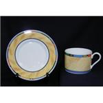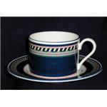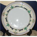 |  FINLANDIA Royal blue china with yellow, blue, pink and green stylized border. Blue trim. |