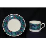 |  AMAZONIA White china with sandy coloured band, flanked by stylized multicoloured border and dark purple inner ring. Light purple trim. |